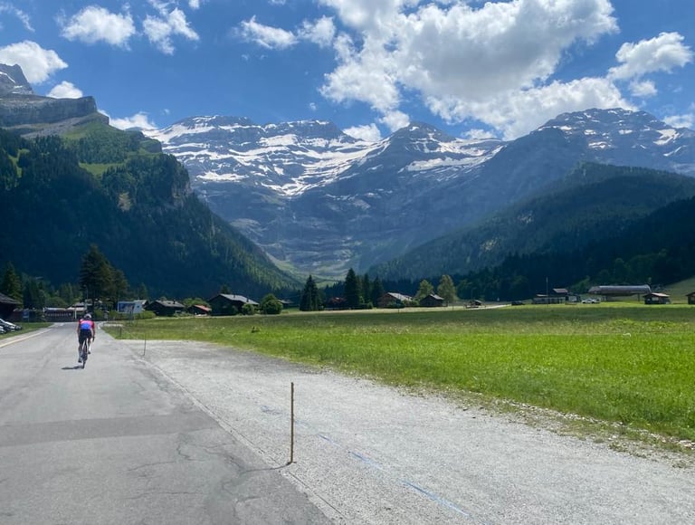 Basés à Champéry, au pied des montagnes du Valais, nous proposons des séjours Route & Gravel en petits groupes, combinant hébergements de standing, logistique complète et moments inoubliables entre passionnés.